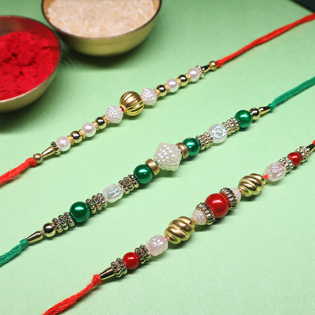 Premium Festive Rakhi Combo – Pearl Luxe & Spiral Bead Trio