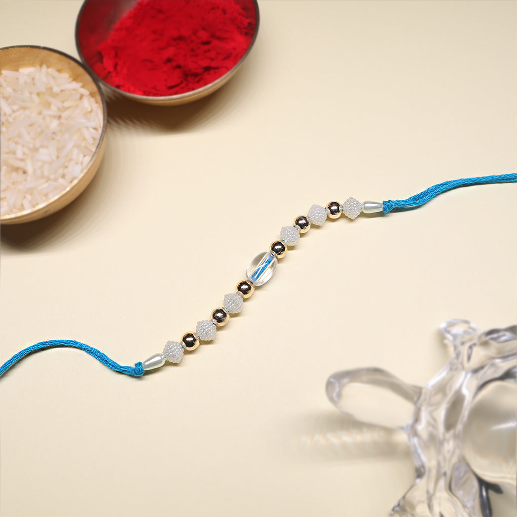 Add a refreshing, modern touch to Raksha Bandhan with the Chic Rakhi Set, featuring two uniquely styled Rakhis that combine crystal clarity with soft festive charm.