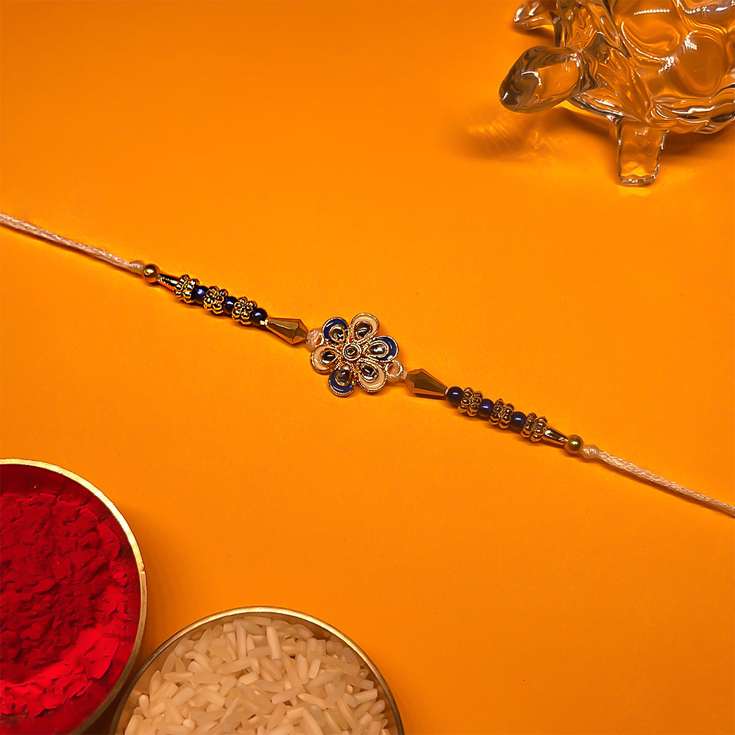 A floral meenakari Rakhi in rich blue and gold tones, adorned with intricate enamel work and flanked by metallic beads and gold pyramid accents, all tied on an elegant ivory-white thread.